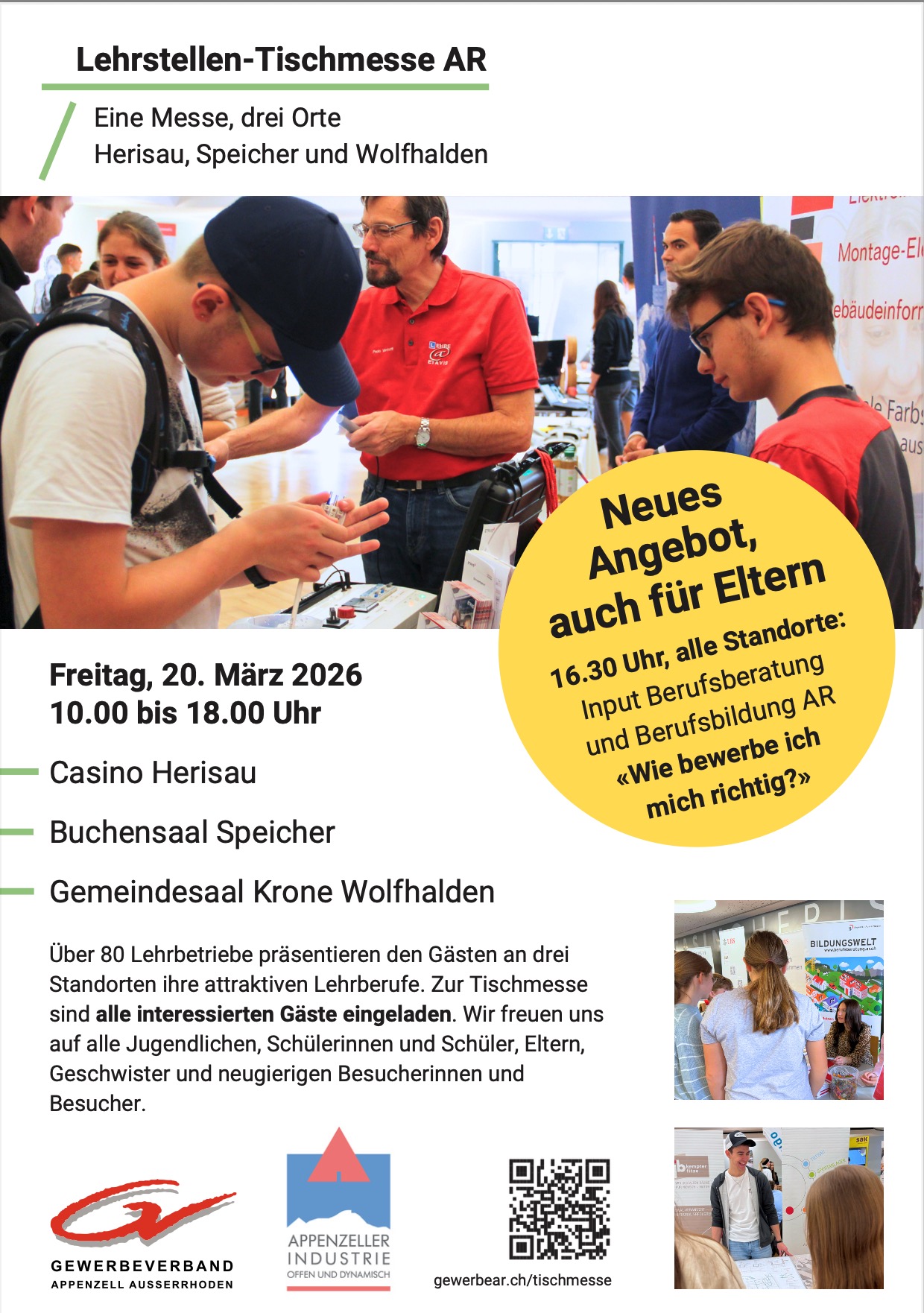 Über 80 Lehrbetriebe präsentieren den Gästen an drei Standorten ihre attraktiven Lehrberufe. Zur Tischmesse sind alle interessierten Gäste eingeladen. Wir freuen uns auf alle Jugendlichen, Schülerinnen und Schüler, Eltern, Geschwister und neugierigen Besucherinnen und Besucher.